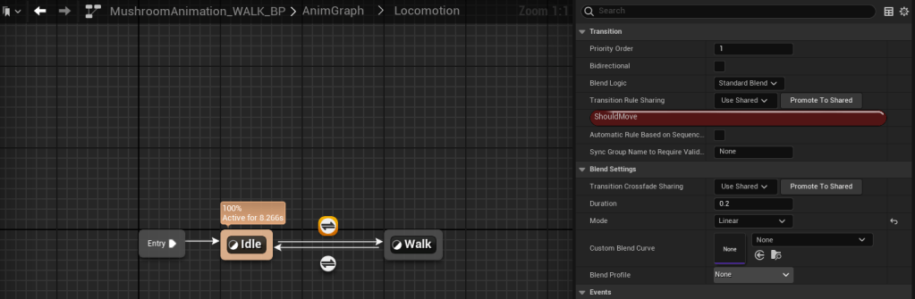 The transition from Idle to Walk is based on ShouldMove and the one from Walk to Idle is NOT ShouldMove.