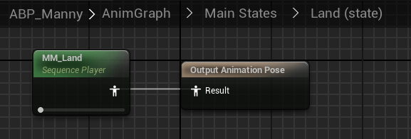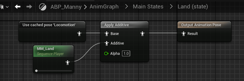 This gave me a pretty good idea of where the problem was. I checked the Land (state) in the Animation Blueprint and sure enough, the “Land” animation sequence had an “Apply Additive” node before the output.