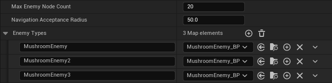 Max Enemy Node Count is the size the TArray<FVector> is initialized to in _enemyNodes. Navigation Acceptance Radius is used as the Acceptance Radius parameter in AAIController::MoveToLocation(). Enemy Types has keys that match the corresponding enemy name in AEnemyNode.