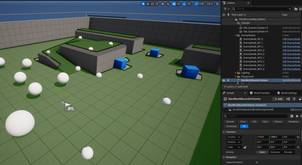 Building a Navigation Mesh was really easy. I just dropped the NavMeshBoundsVolume into the scene and it worked! The hotkey for visualizing the Nav Mesh is P.