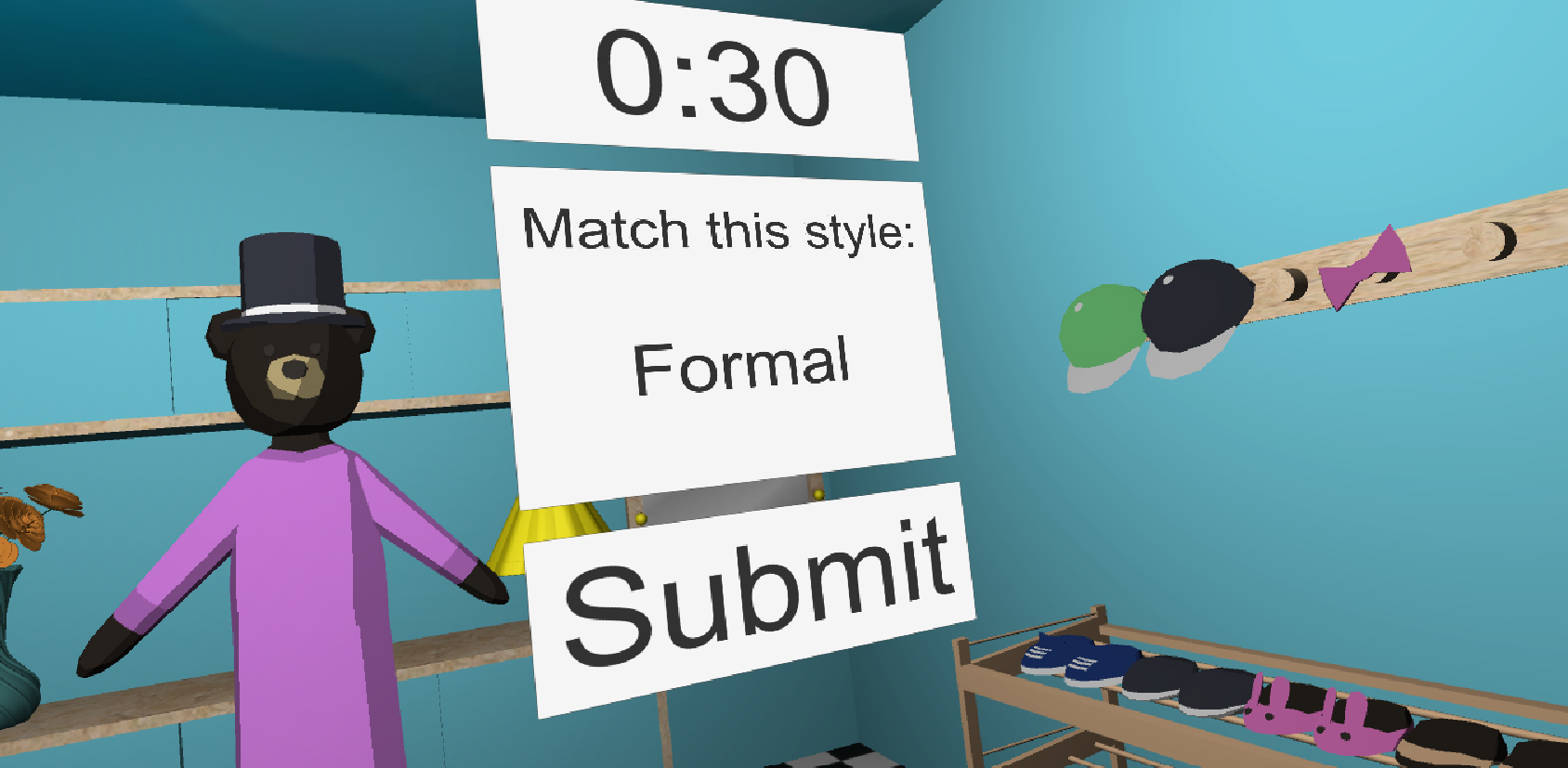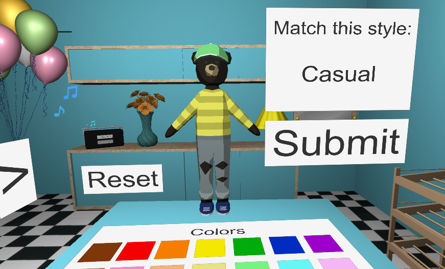 It is a mobile VR game for the Google Daydream designed to teach how to dress through different prompts including casual, formal, business casual, wedding, and several others. There are a variety of different clothes and colors to choose from. After the player finishes dressing up the bear, they get scored on how well the clothes they chose match the given prompt. There is a timed and untimed mode available.